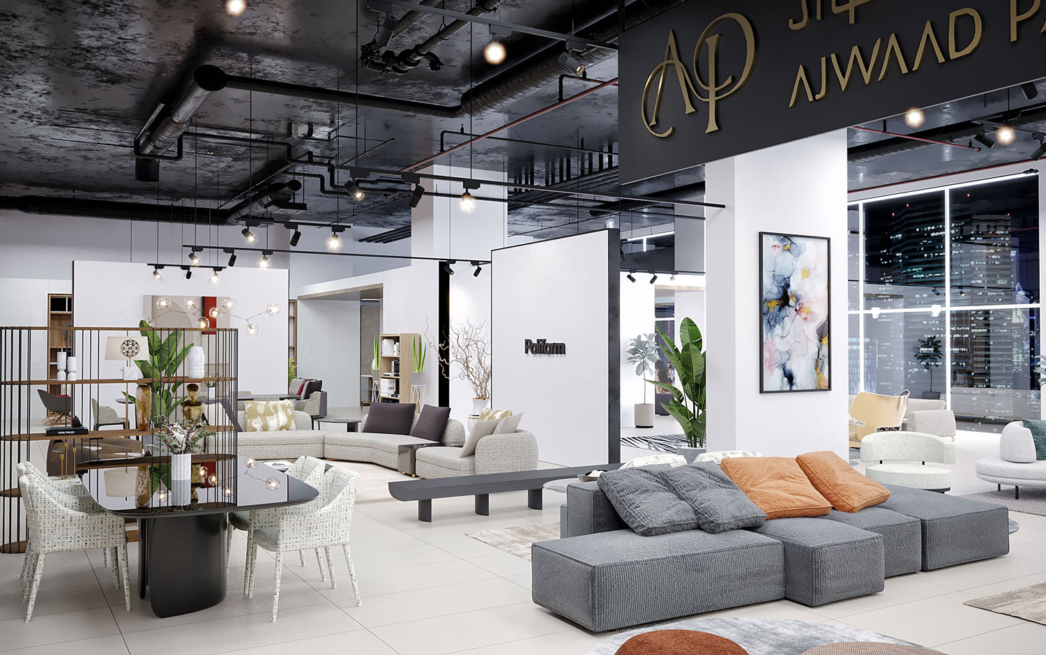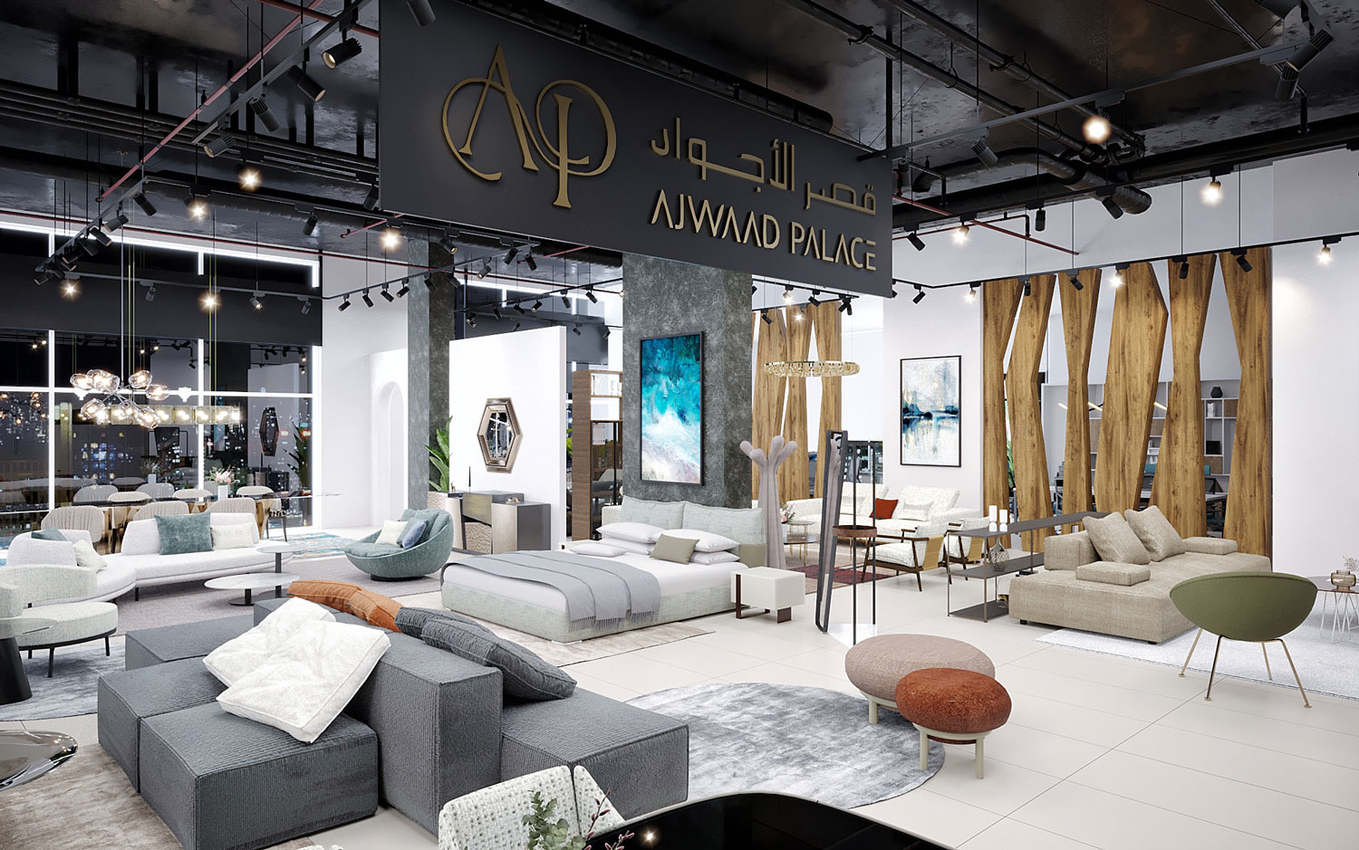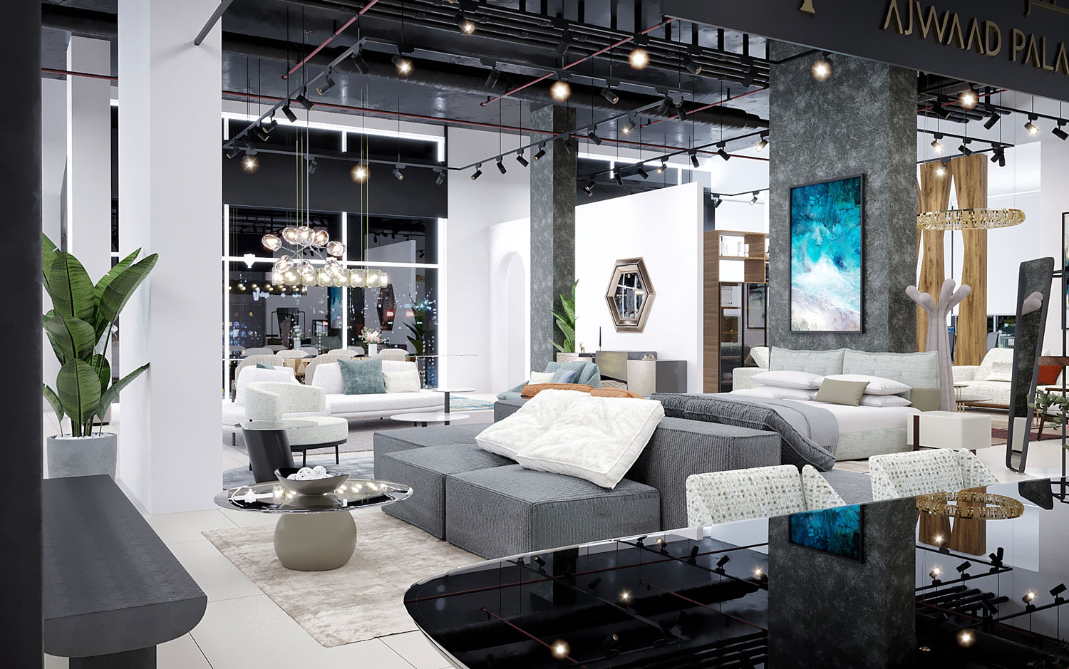 The design concept of the Ajwaad Palace showroom is inspired by the essence of residential living, where comfort, warmth, and elegance come together to create a welcoming and immersive environment.