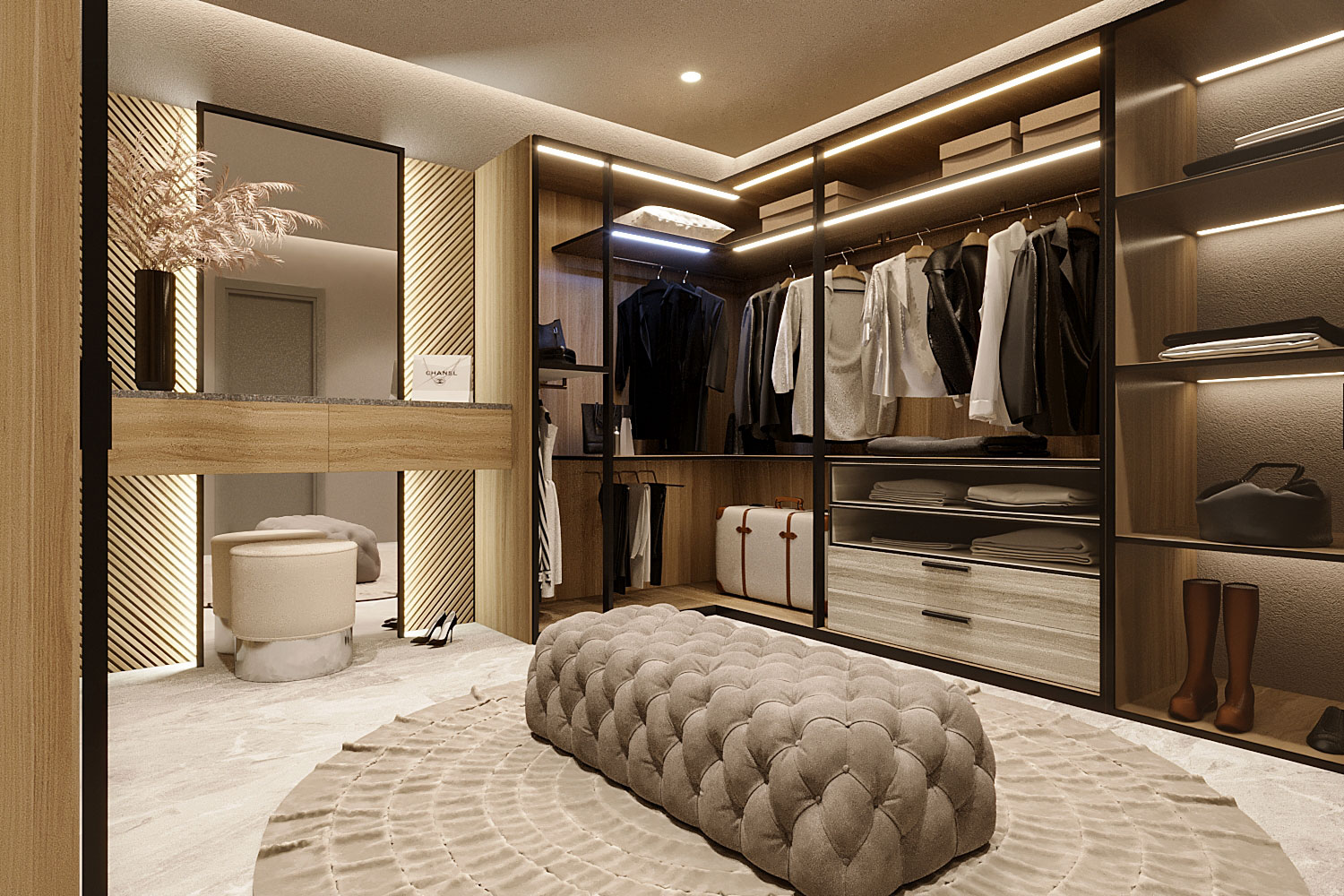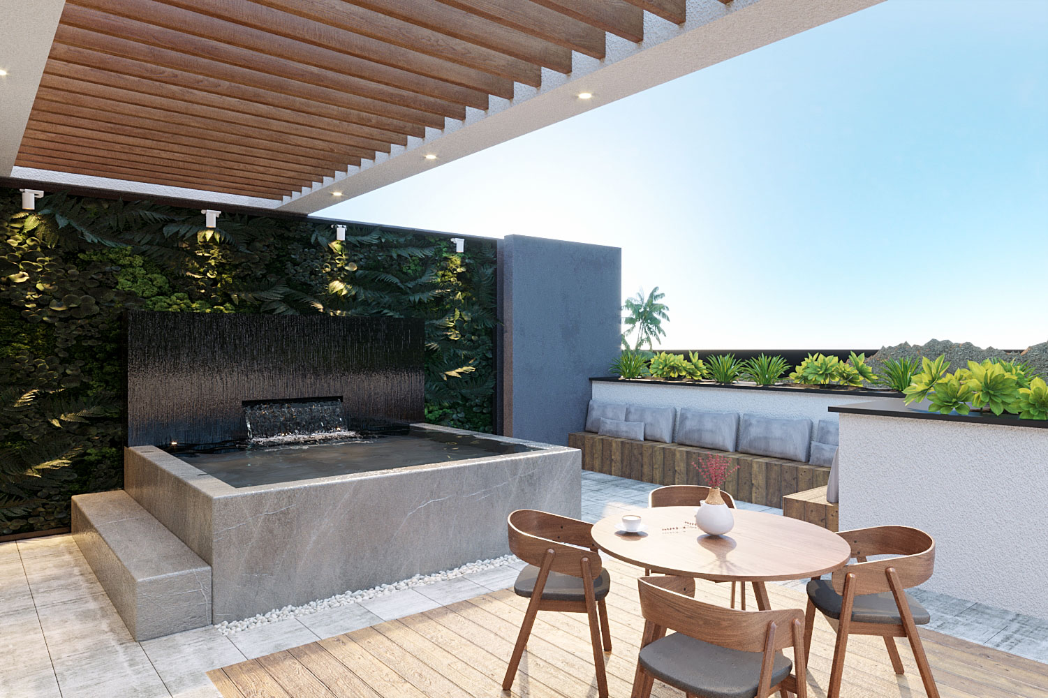 On the first floor, there’s a cozy pantry, a lounge, a library, and two bedrooms. The penthouse level serves as a luxurious master suite complete with a walk-in closet, a spacious bathroom, and a private lounge area that opens onto a rooftop with a jacuzzi and garden, making it feel like a complete suite on its own.