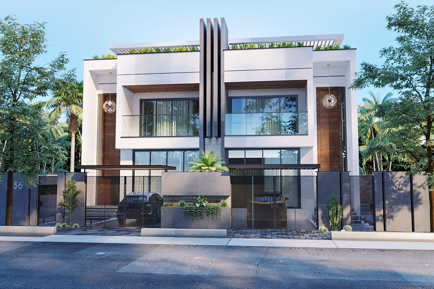 The Brothers’ Twin Villa is a stunning duplex designed symmetrically for two brothers, featuring a semi-detached layout that extends into a stylish penthouse on the top level. Essentially forming a triplex, the villa is located in the Al Mawaleh area of Muscat and offers a perfect blend of modern architecture and functional elegance.