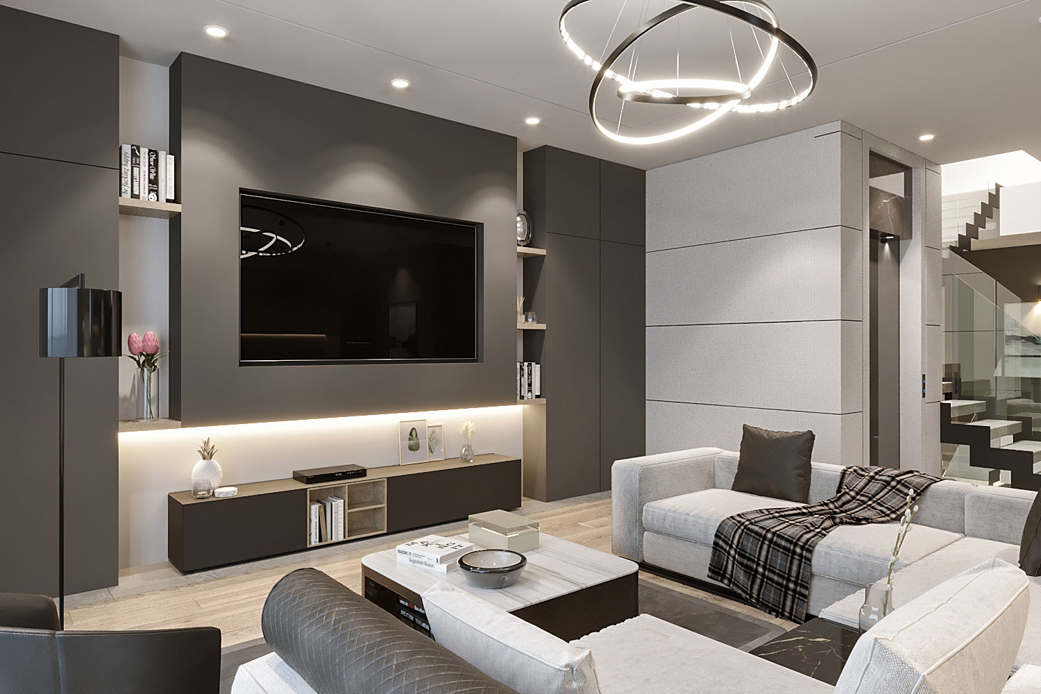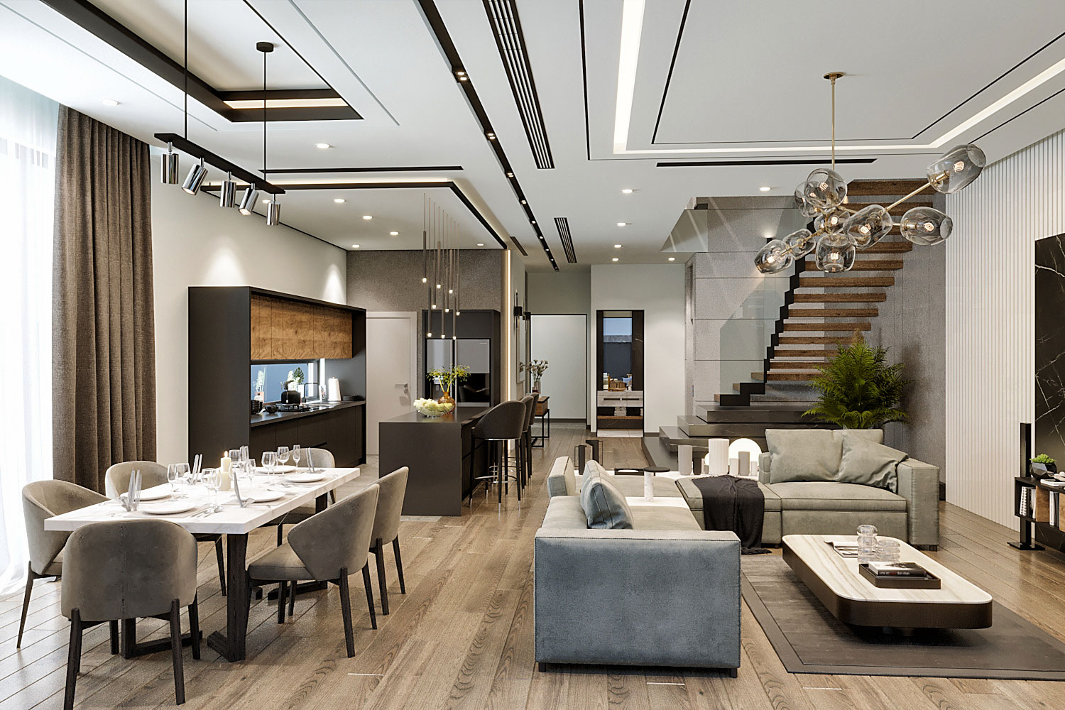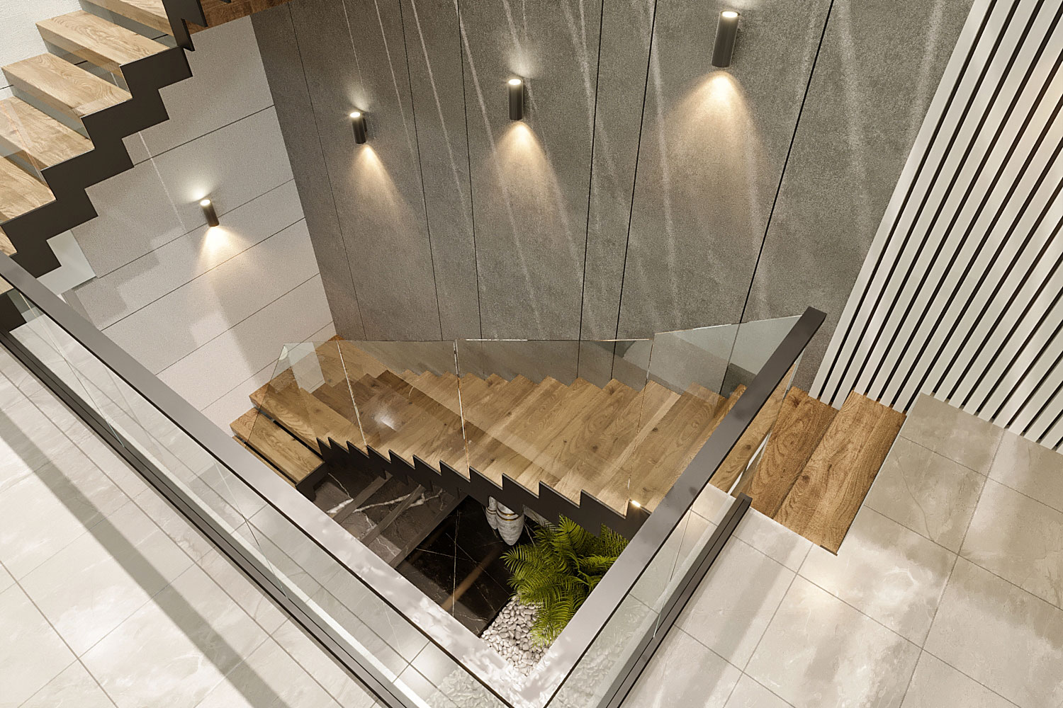 This project includes double-height areas to create a sense of openness and allow natural light to flood the interior. The entrance and public areas are thoughtfully separated from the private living spaces with a filter, ensuring privacy and comfort. The villa sits on a 600-square-meter plot and includes a compact yet exclusive back garden, a sleek modern staircase with greenery and a void allowing natural light from above, and a state-of-the-art kitchen on the ground floor.