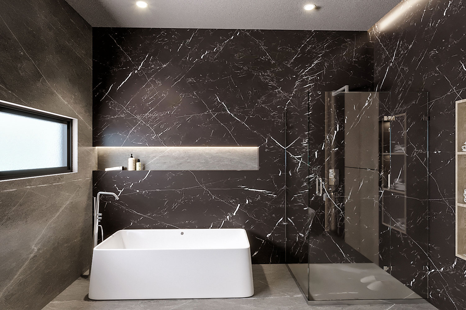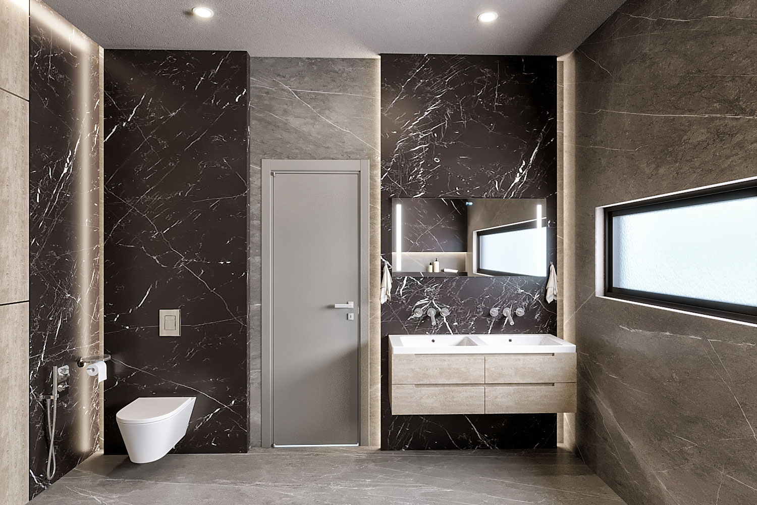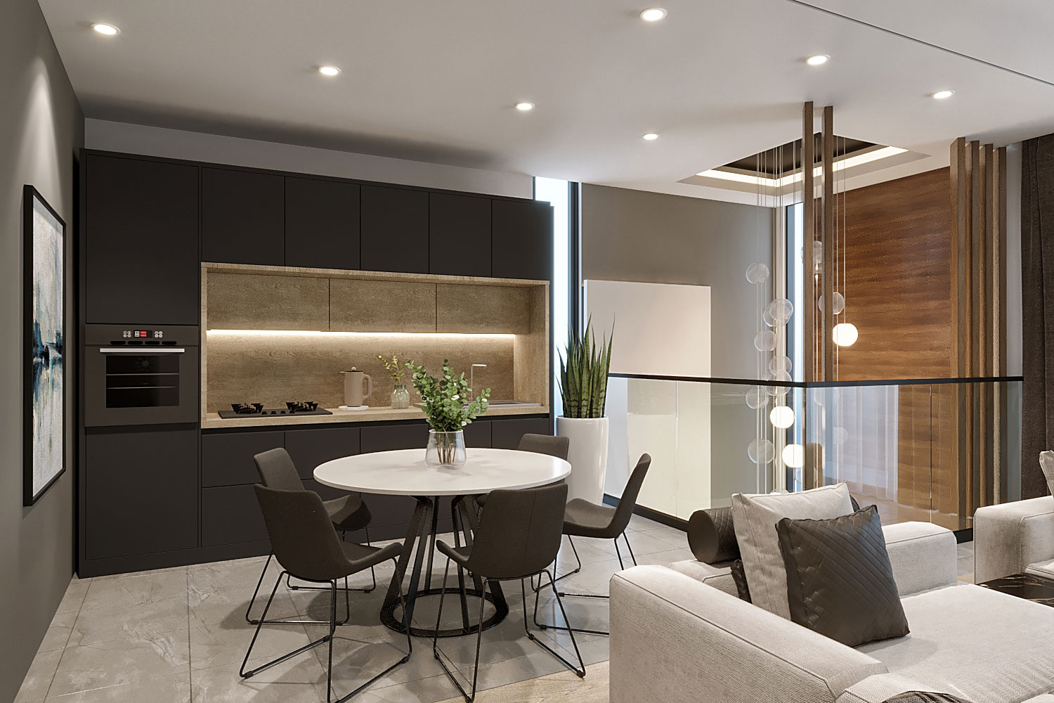 This project includes double-height areas to create a sense of openness and allow natural light to flood the interior. The entrance and public areas are thoughtfully separated from the private living spaces with a filter, ensuring privacy and comfort. The villa sits on a 600-square-meter plot and includes a compact yet exclusive back garden, a sleek modern staircase with greenery and a void allowing natural light from above, and a state-of-the-art kitchen on the ground floor.