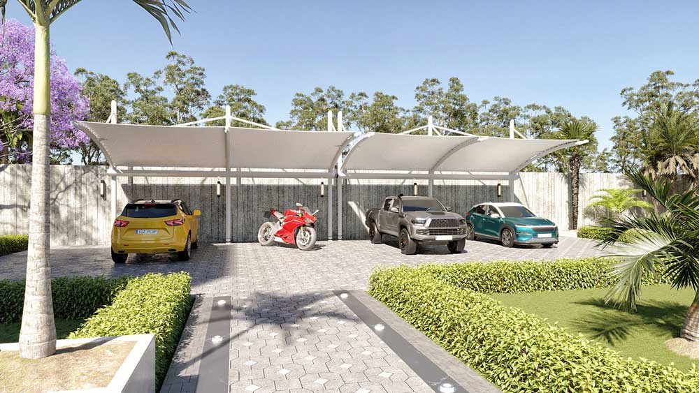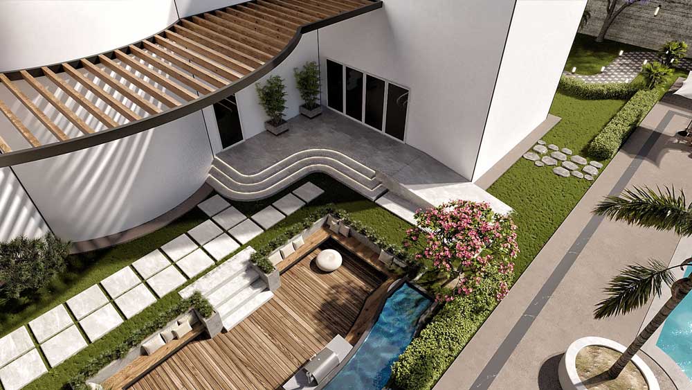 In addition to these features, the estate includes a thoughtfully hidden maid’s quarters, a glass-walled gym overlooking the lawn, and a multi-purpose entertainment hall. The pathways are elegantly paved with lush stone, and the landscape is adorned with colorful, classic-style planting and a mix of royal palm, coconut, and frangipani trees, enhancing the luxurious atmosphere.