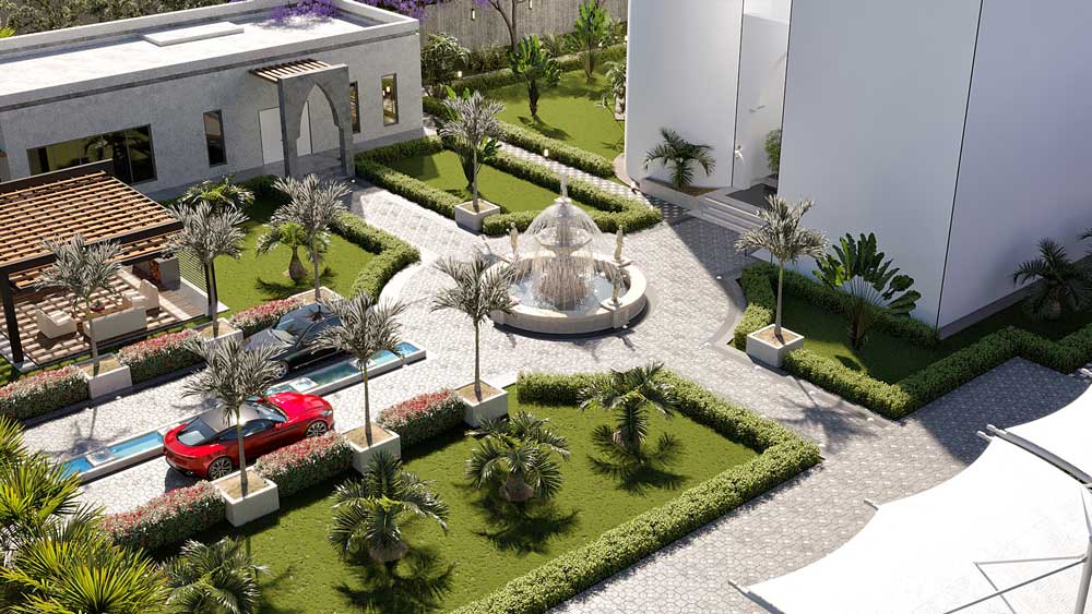The concept behind the Royal Landscape is to craft a refined, classical oasis that pays homage to both timeless European garden aesthetics and the natural beauty of Oman. This design approach focuses on creating a grand, inviting entrance that sets the tone for a luxurious and harmonious environment. By integrating classic elements like a central fountain and structured planting areas with the lush greenery of palm and frangipani trees, the space becomes a blend of elegance and local charm.